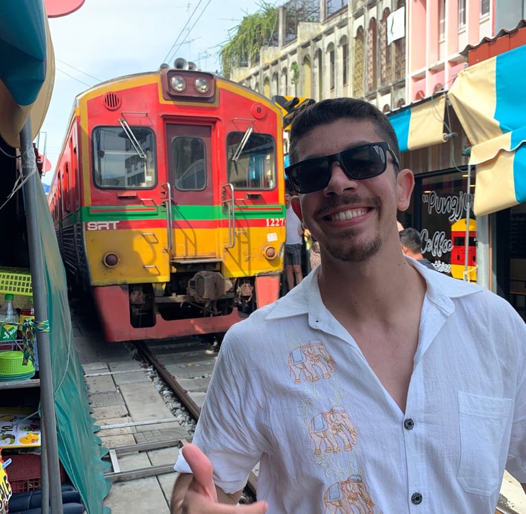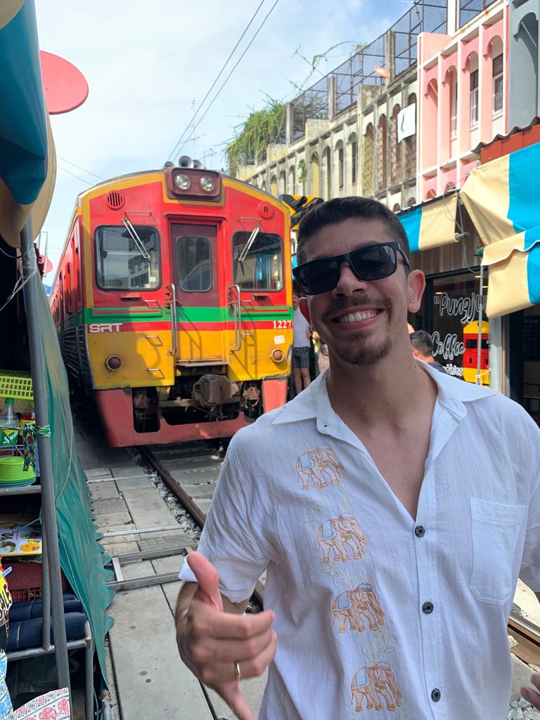 Você conhecerá o icônico mercado do trem (Maeklong railway), onde os feirantes vendem seus produtos ao longo dos trilhos do trem, montando e desmontando suas barracas à medida que o trem passa! Depois levaremos você para fazer um passeio de canoa pelo Mercado Flutuante (Damnoem saduak).